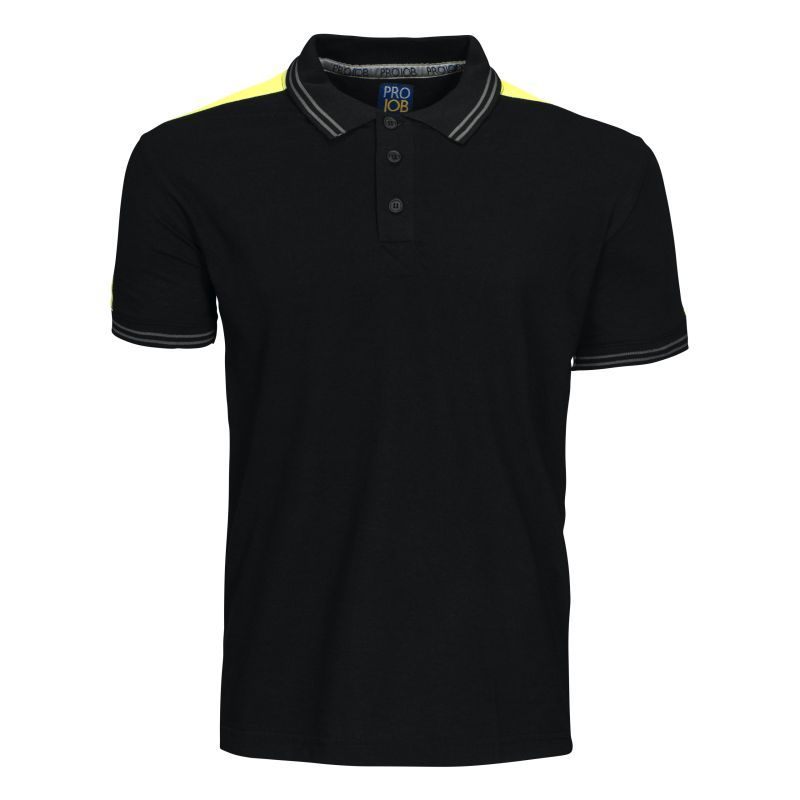 Lyhythihainen pikeepaita. Kaulus ja hihansuut joustinneulosta. Napituslistassa kolme nappia. Olkapäillä fluoresoivaa kangasta.