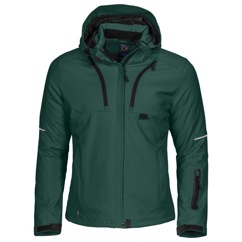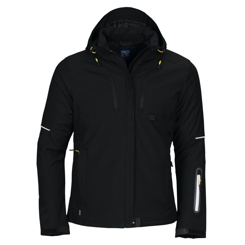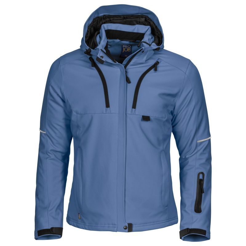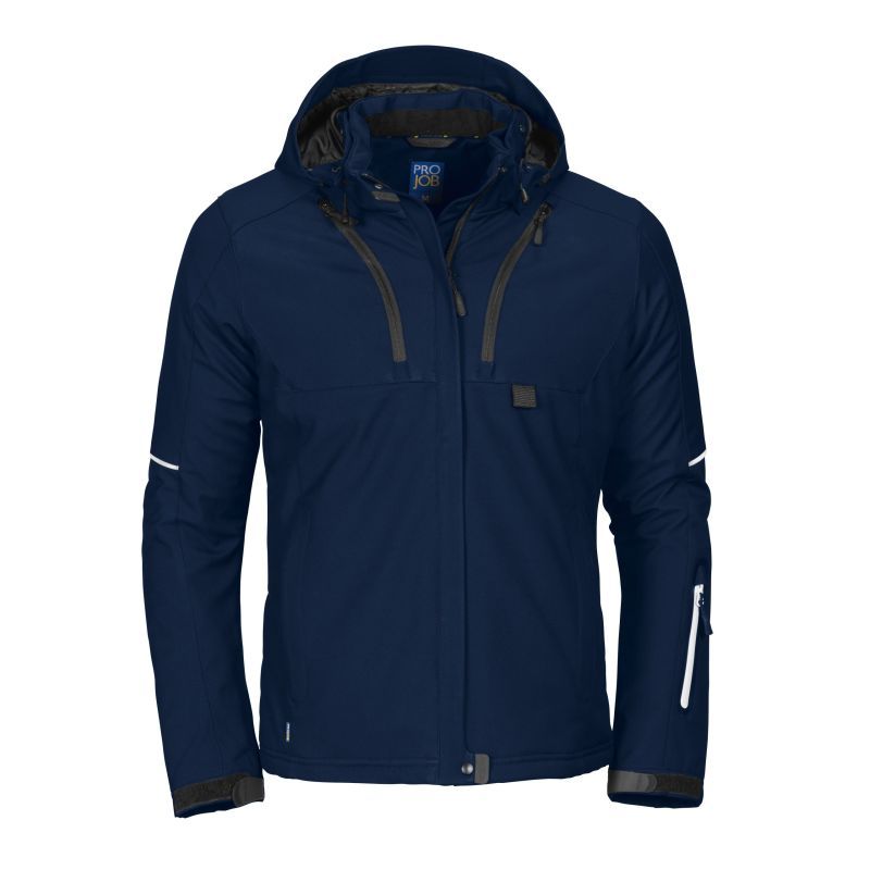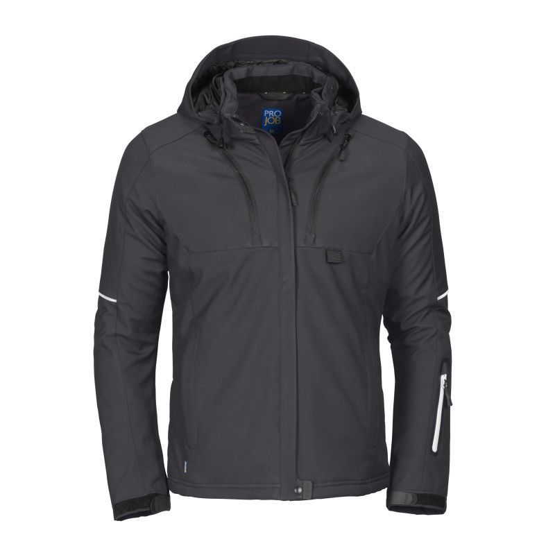 Tuulen- ja vedenpitävä 3-kerroksinen tekninen softshell-takki. Tikattu toppavuori. Kaksi rintataskua, joista vasemmassa puhelintasku. Paikka ID-korttipidikkeelle. Kaksi vetoketjullista sisätaskua, joista suurempaan mahtuvat esim. paperit. Kaksi sivutaskua. Hihatasku vasemmassa hihassa. Vasemmalla puolella sisätasku, jossa aukko kuulokejohdolle. Ilmanvaihtoa parantavat vetoketjut kainaloissa. Vyötäröllä kiristysnauha. Säädettävät hihansuut. Pidennetty selkäosa lisää käyttömukavuutta. Heijastavat tereet hihoissa ja selkäosassa. Säädettävä ja irrotettava huppu. Kauluksessa ja sisätaskuissa mukava fleecevuori.