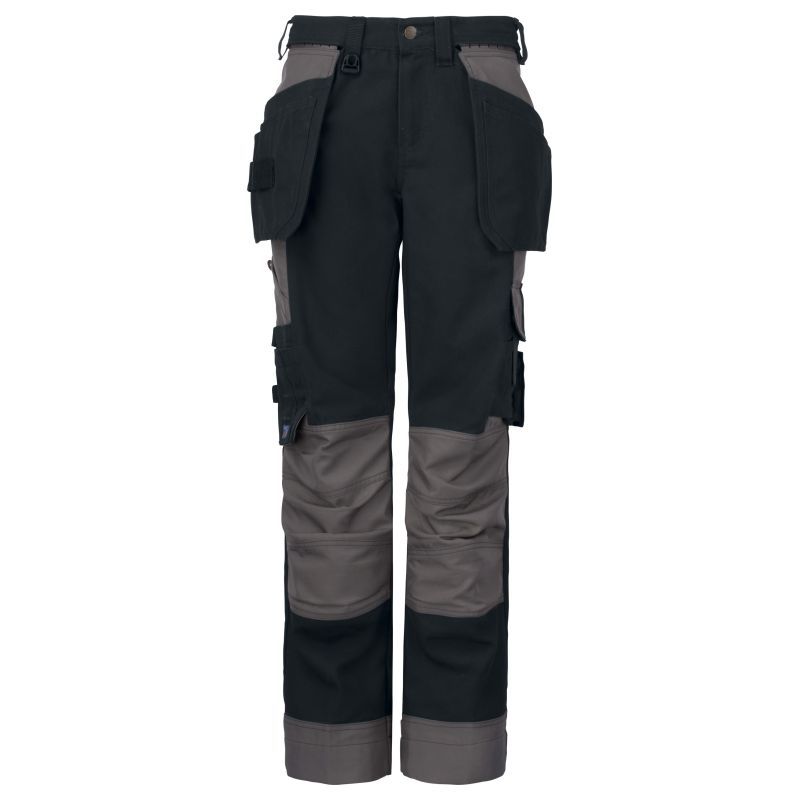 Naisten housut, joissa kaksi sivutaskuihin työnnettävissä olevaa roikkuvaa naulataskua| toisessa lisätasku ja toisessa työkalulenkkejä. Naulataskut on vahvistettu 100 % Corduralla®. Reisitaskuissa paikat puhelimelle, kynille ja työkaluille. Kaksi säädettävää vasaralenkkiä. Kaksi D-rengasta. Mittatasku, jossa työkalutasku ja puukkonappi. Cordura®-vahvistetut sisäpuolelta avattavat polvisuojataskut ja korkeussäädettävät polvisuojat. Muotoillut polvet. Suuret takataskut| vasemmanpuoleisessa läppä. Taka- ja reisitaskuissa on lenkit. Paikka ID-korttipidikkeelle.