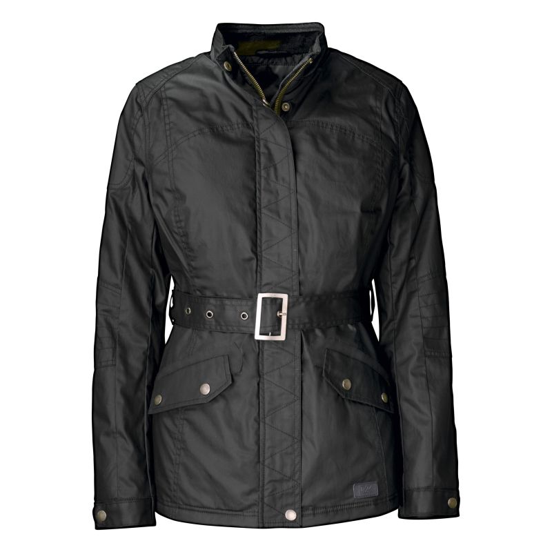 Naisten pintakäsitelty puuvillakankaasta valmistettu takki, jossa tyylikäs mattapinta| hylkii kevyttä sadetta ja likaa. Takin vuoressa timanttikuvioista tikkausta. Takissa on neljä huolella ommeltua taskua ulkopuolella sekä povitasku lompakolle tai puhelimelle. Nahka- tai vahakangastakkeihin verrattuna tämän kumimaisella pinnalla varustetun takin etuna on se, että se soveltuu moniin käyttötarkoituksiin ja voidaan pestä koneessa. Miesten takki on riittävän pitkä peittämään bleiserin. Naisten takissa on irrotettava vyö. Metalliset napit ja vetoketju antavat muodikkaan biker-henkisen vaikutelman.
