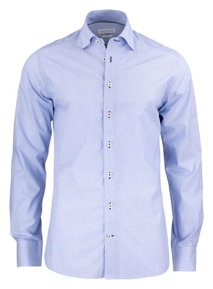 | Materiaali | • Sininen jacquard –kudottu kangas. • Kangaslaatu: 100 % pitkäkuituista ja tiheää puuvillaa. • Mekaaninen stretch. • Konepestävä. Non-iron patentoitu, ympäristöystävällinen menetel |